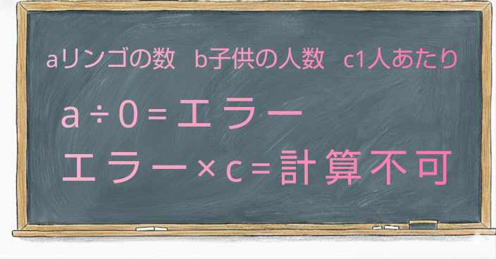 a÷b=cなのでb×c=aが成り立ちますが子供が居ない場合はエラーになります式通りにエラーで処理する考え方では推測が行き詰まります ここで少し視点を変えてみます この例では余ったリンゴの数を使います 余ったリンゴ